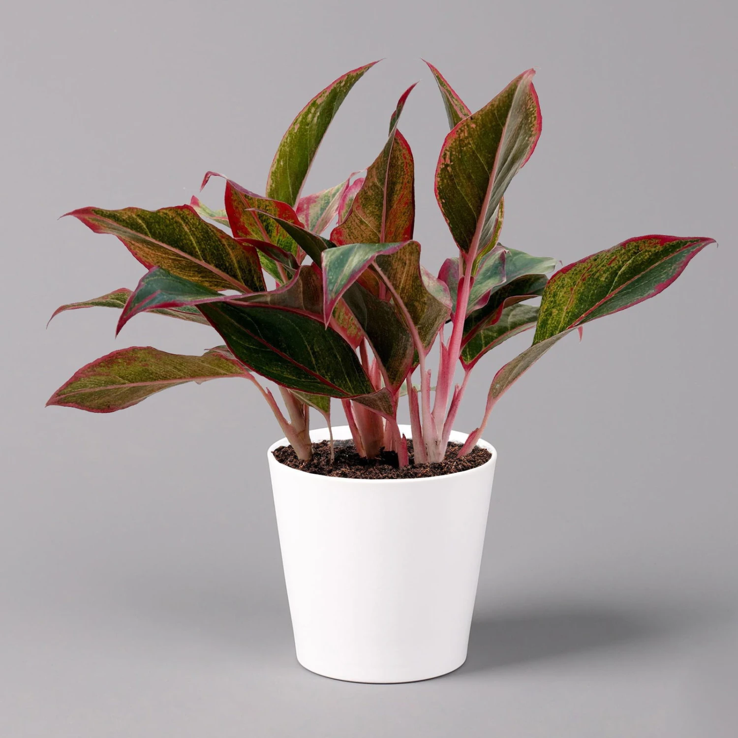 Der Kolbenfaden (Aglaonema ‚Crete‘) gehört zu den Aronstabgewächsen, stammt ursprünglich aus Südostasien und ist vor allem wegen seiner malerischen Blattzeichnung beliebt. Die elliptischen Blätter mit langen rosa Stielen sind ganzjährig sattgrün, können bis zu 30 cm lang werden und besitzen eine besondere auffällige pinke Umrandung und Blattmitte. Die pflegeleichte Schmuckblattpflanze wächst aufrecht und mit genug Platz kann sie bis zu 1 m groß werden.