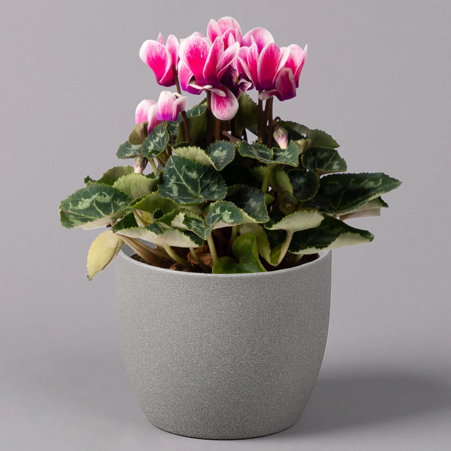 Das Zimmer-Alpenveilchen (Cyclamen persicum) ist eine der beliebtesten Blühpflanzen fürs Zimmer und erleuchtet mit seinen farbenfrohen Blüten die dunkle Herbst- und Winterzeit. Charakteristisch sind die herzförmigen Blätter, die mit silbernen Mustern versehen sind. Die Blätter der mehrjährigen Pflanze entspringen einer Knolle und bilden eine Rosette, aus der die Blüten an langen Stielen hervorgebracht werden. Das Alpenveilchen kann eine Höhe von bis zu 40 cm erreichen.