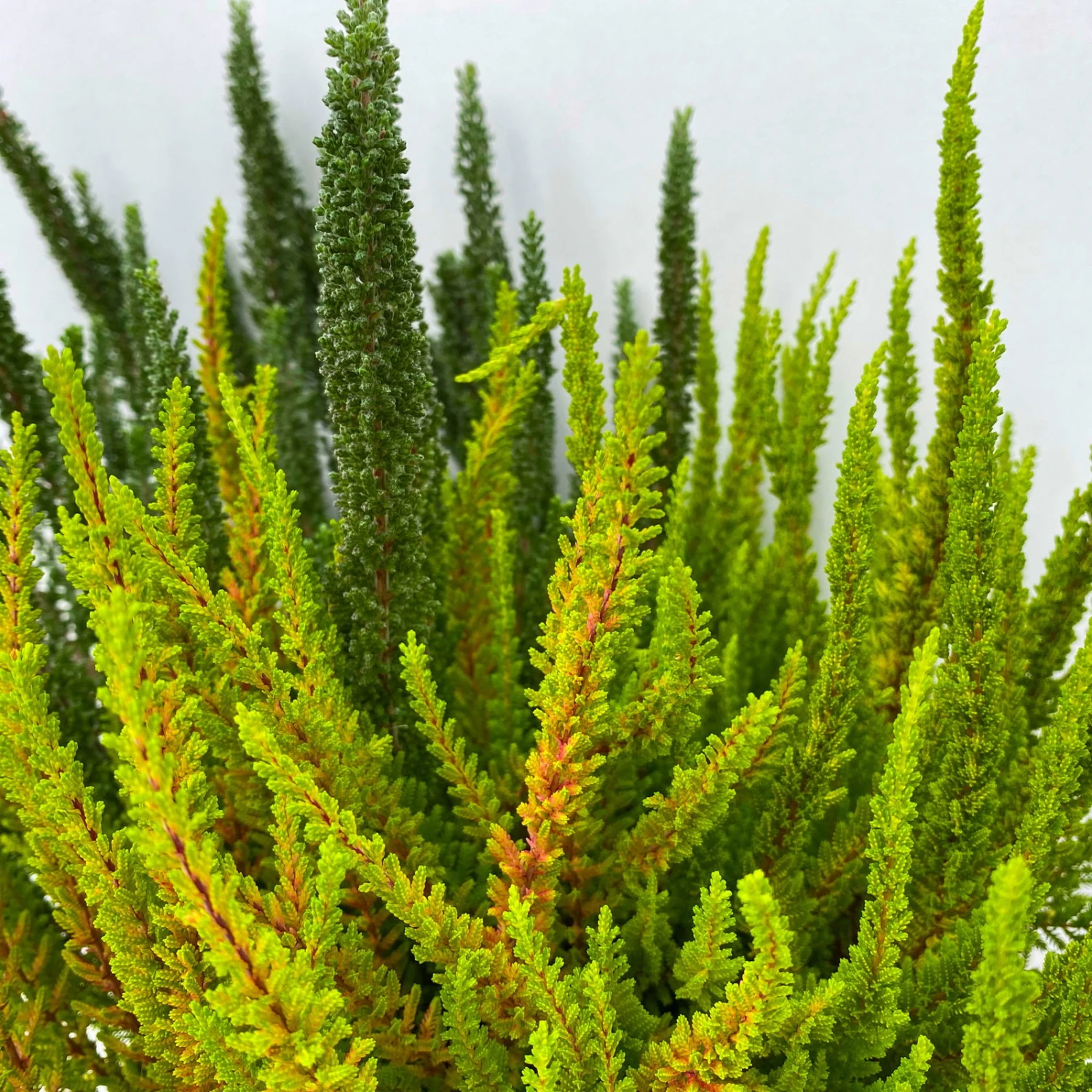 Die schuppenförmig, nach oben eingerollten, ledrigen Blätter der Besenheide (Calluna vulgaris SKYLINE® ‚Trio‘) liegen an den Zweigen an. Für Calluna vulgaris SKYLINE® ‚Trio‘ wurden 3 Sorten in einem Topf kultiviert. Sie wird auch Strukturheide, Sommerheide oder Heidekraut genannt. Die Besenheide wächst aufrecht und überzeugt durch eine attraktive, immergrüne Struktur, die in roten, gelben und grünen Spitzen mündet. Der winterharte Zwergstrauch kann eine Wuchshöhe von 30 bis 50 cm erreichen und auch ebenso breit werden.