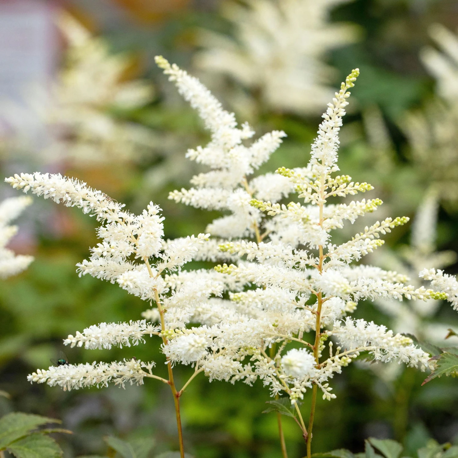 Prachtspieren blühen im Sommer zwischen Juni und August. Sie erfreuen mit einer farbenprächtigen, lange anhaltenden Blüte und tauchen den sommerlichen Garten in ein ganz besonderes Licht. Über dem kontrastreichen, sattgrünen Laub entfalten die weißen Blüten eine besondere Wirkung, die auch aus der Ferne überzeugt. Besonders an Standorten, an denen die Blütenpracht mit ausreichend durchlässigem Boden und Nährstoffen versorgt wird, entsteht ein eleganter Blütenzauber. Astilben werden auch als Prachtspieren bezeichnet und überzeugen mit ihrer Eleganz. Sie eignen sich ideal, um halbschattige Standorte im Garten zu bepflanzen. Die winterharten Stauden sind absolut pflegeleicht und anspruchslos, auch Schnecken schaden den wüchsigen Pflanzen nicht.