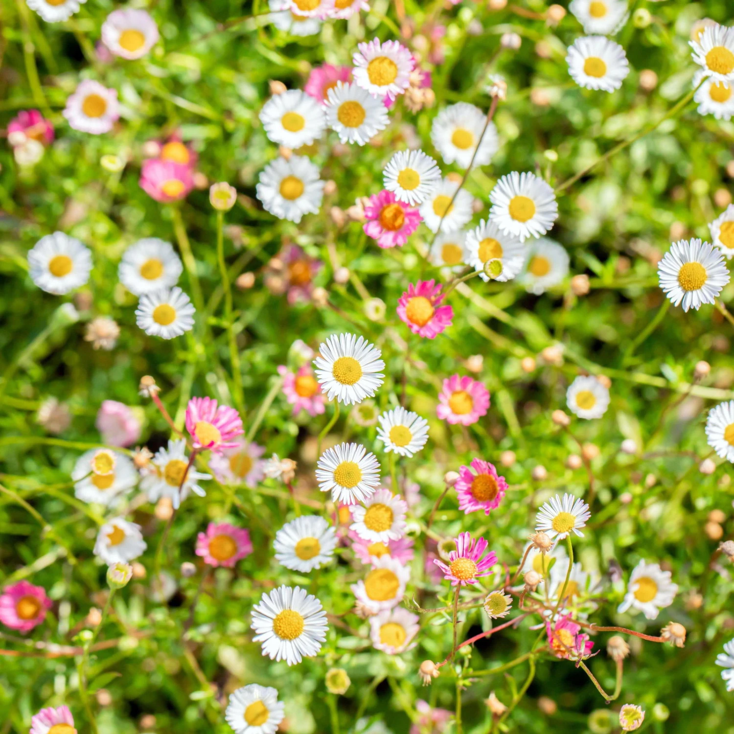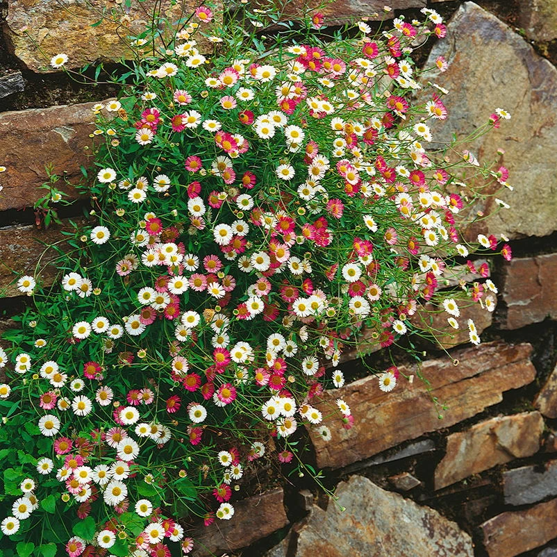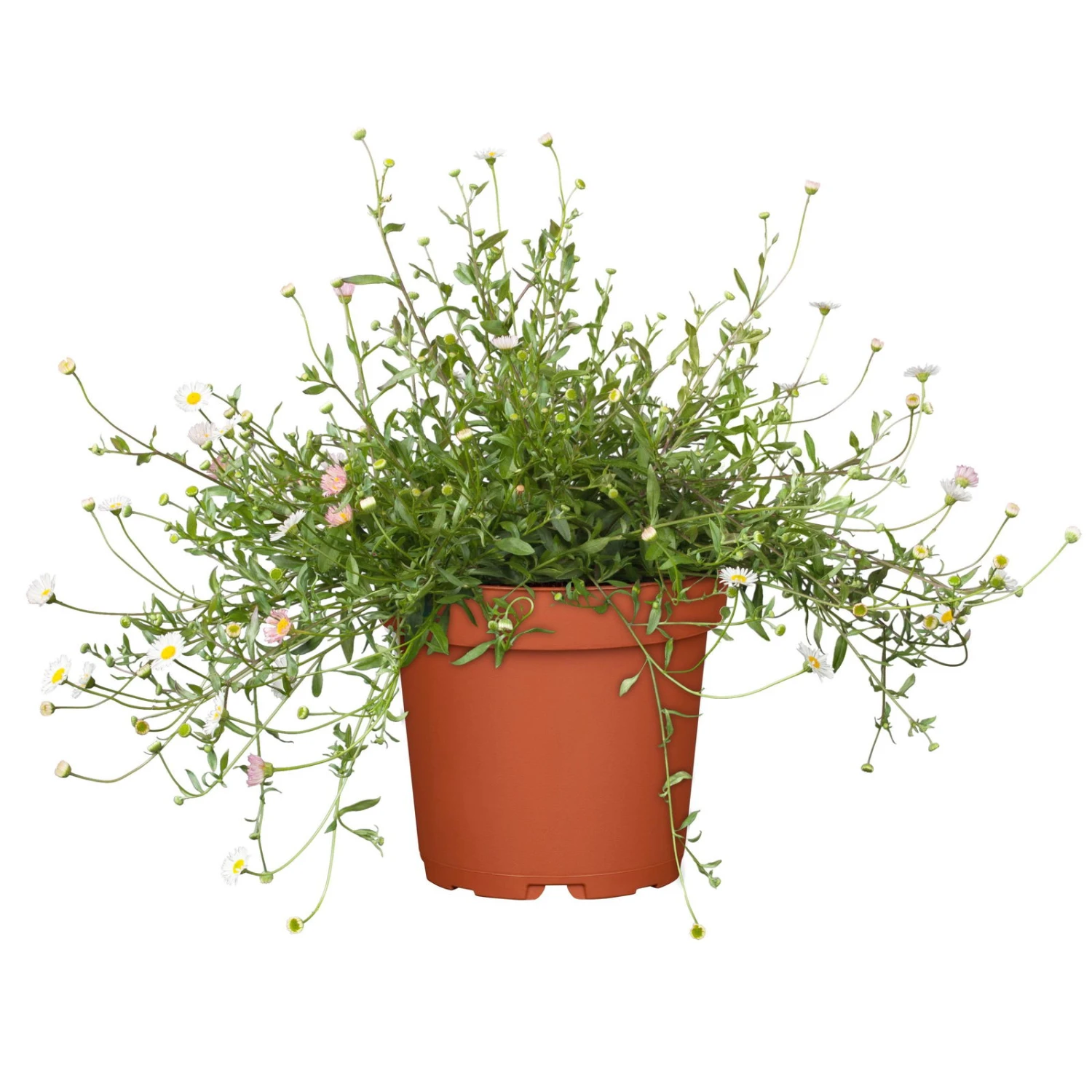 Das Spanische Gänseblümchen ‚Blütenmeer‘ (Erigeron karvinskianus ‚Blütenmeer‘) begeistert als gut frostverträglicher Dauerblüher, der nicht nur im Garten, sondern auch als Ampelpflanze, im Balkonkasten oder Pflanzkübel begeistert. Zur Blütezeit zwischen Juni und Oktober erfreut die Gartenstaude mit weißen Blüten, deren Strahlkraft durch die dunkelgrünen, eiförmigen Blätter unterstrichen wird. Bevorzugt wächst die winterharte Staude an einem sonnigen Standort, der Boden sollte gut durchlässig sein. Mit einer Wuchshöhe zwischen 20 und 30 cm eignet sich das buschig wachsende Spanische Gänseblümchen zur Gruppenpflanzung im Stein- oder Bauerngarten oder auch als Unterpflanzung in Pflanzkübeln. Die schneckenunempfindliche Staude blüht den ganzen Sommer und ist außerdem eine hervorragende Bienenweide.