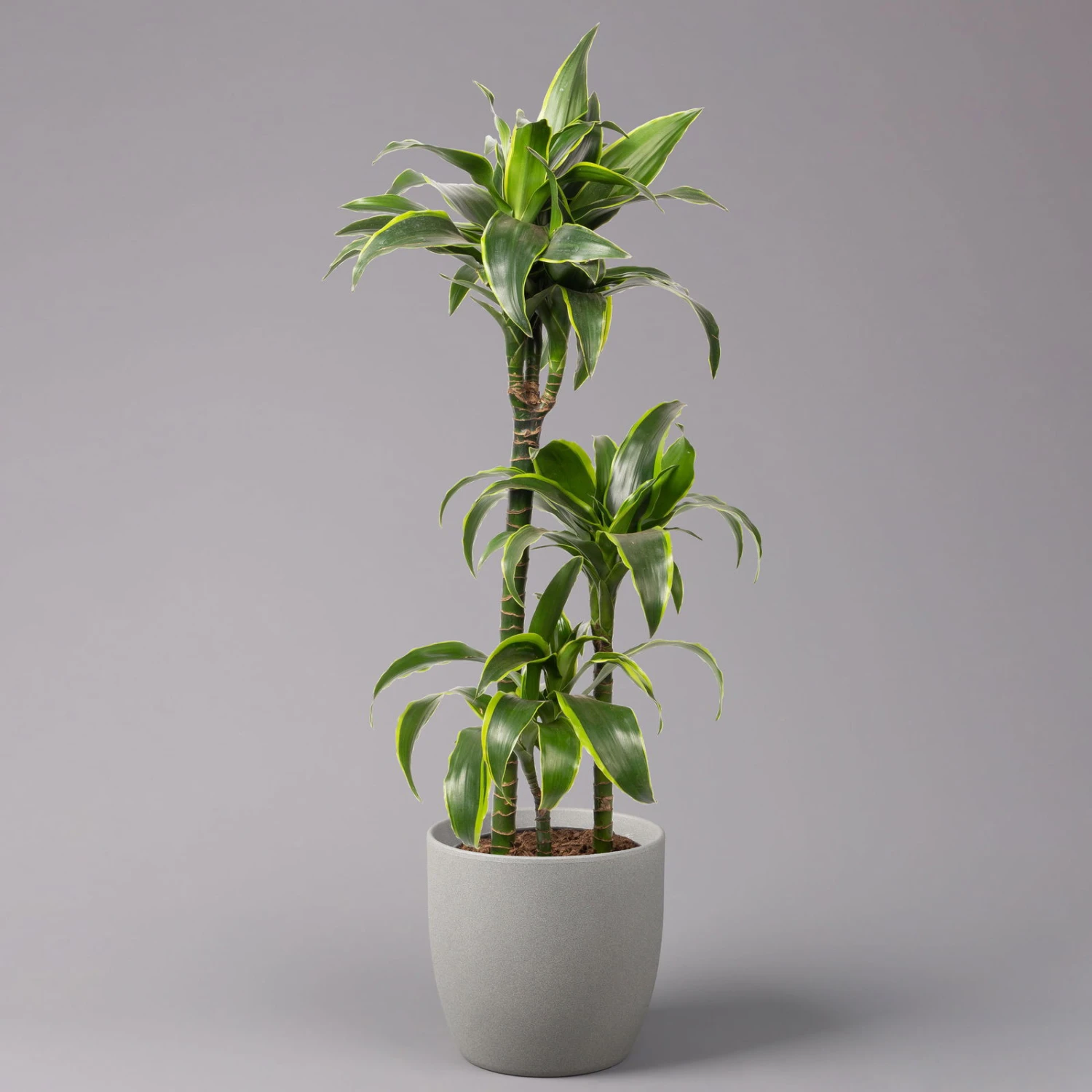 Sie erhalten Ihre Dracaena fragrans ‚Dorado‘ in einem 3er-Tuff mit unterschiedlich hohen Stämmen, um einen beeindruckenden immergrünen Akzent im Wohn- oder Arbeitszimmer zu setzen. Diese ungewöhnliche Zimmerpflanze sieht dank ihrer relativ breiten Blätter mit einer filigranen gelben Umrandung effektvoll aus. Dabei ist die Dracaena fragrans ‚Dorado‘ wie alle Drachenbäume ein leistungsstarker, natürlicher Luftfilter. Mithilfe dieser Wohlfühlpflanze verbessern Sie dauerhaft das Raumklima. Es sind vor allem Formaldehyd und Benzol, die ein Drachenbaum der Luft entzieht. Da sich diese gesundheitsschädlichen Substanzen unter anderem beim Betrieb der modernen Bürotechnik sowie beim Rauchen oder Kochen bilden, stellt die Dracaena ‚Dorado‘ für ein Büro, eine Küche oder Raucherwohnung die richtige, pflegeleichte Lösung dar. Ihre Dracaena fühlt sich an einem halbschattigen Standort wohl und benötigt nur wenig Wasser.