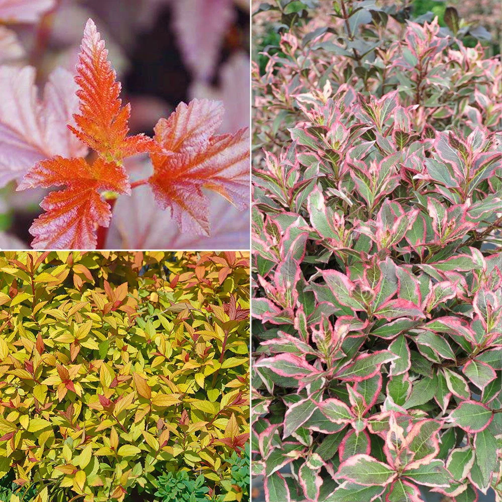 Buntlaubige Gehölze bringen Farbe und Abwechslung in Ihren Garten. Im Gehölz-Set buntlaubig Nr. 2 sind drei Gehölze enthalten, die alle mit einer traumhaften Blattfärbung begeistern: Rotlaubige Blasenspiere ‚Lady in Red’®, Goldlaubige Japan-Spiere und Buntlaubige Weigelie.