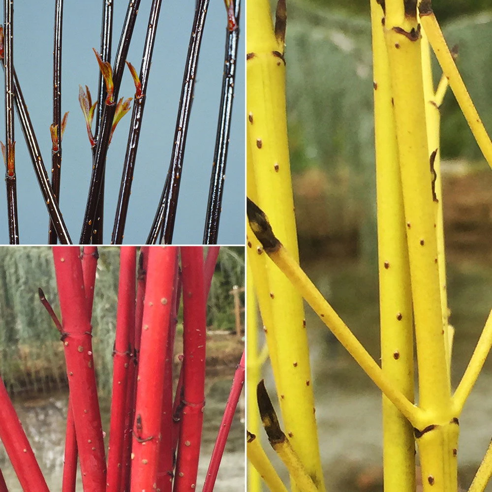 Schwarz-rot-goldener Pflanzenschmuck hält Einzug in Ihrem Garten. Diese Hartriegel Kollektion besteht aus einem Schwarzholz-Hartriegel (Cornus alba ‚Kesselringii‘) mit tiefschwarzen Trieben, einem Gelbholz-Hartriegel (Cornus sericea ‚Flaviramea‘) mit leuchtend hellgrüngelben Trieben und einem Purpur-Hartriegel (Cornus alba ‚Sibirica‘), dessen Triebe im Winter leuchtend rot gefärbt sind und Farbe in den Garten bringen.