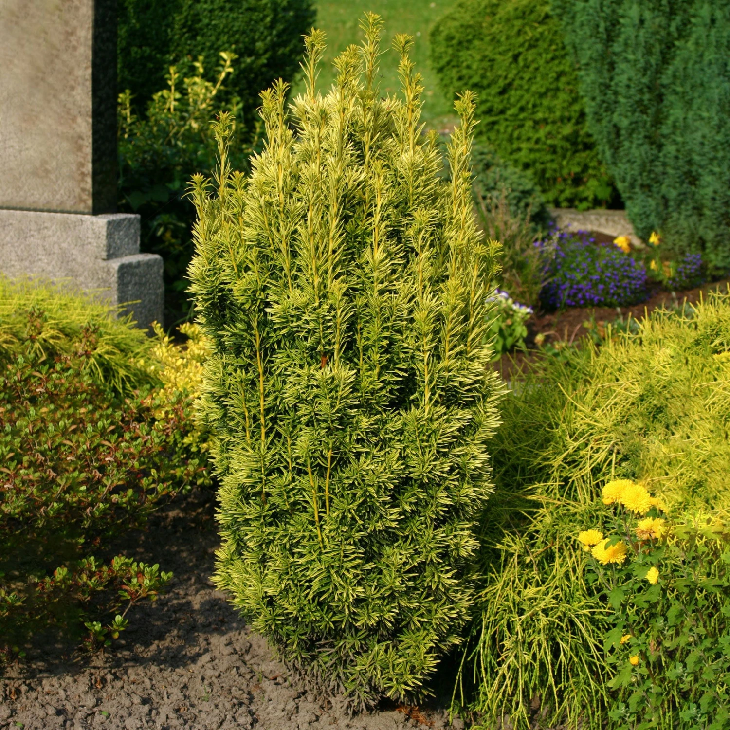 Die Gelbe Säuleneibe ist ein wintergrünes und schlankes Nadel-Gehölz, das keinen Rückschnitt benötigt. Ihre Gelbe Säuleneibe begeistert mit dekorativen Farbverläufen, erreicht imposante Wuchshöhen über 350 Zentimetern und stellt keine hohen Ansprüche an die Pflege. Dieses Ziergehölz macht als Solitär eine ausgezeichnete Figur und ist unter anderem für die Grabpflege genau die richtige Wahl.