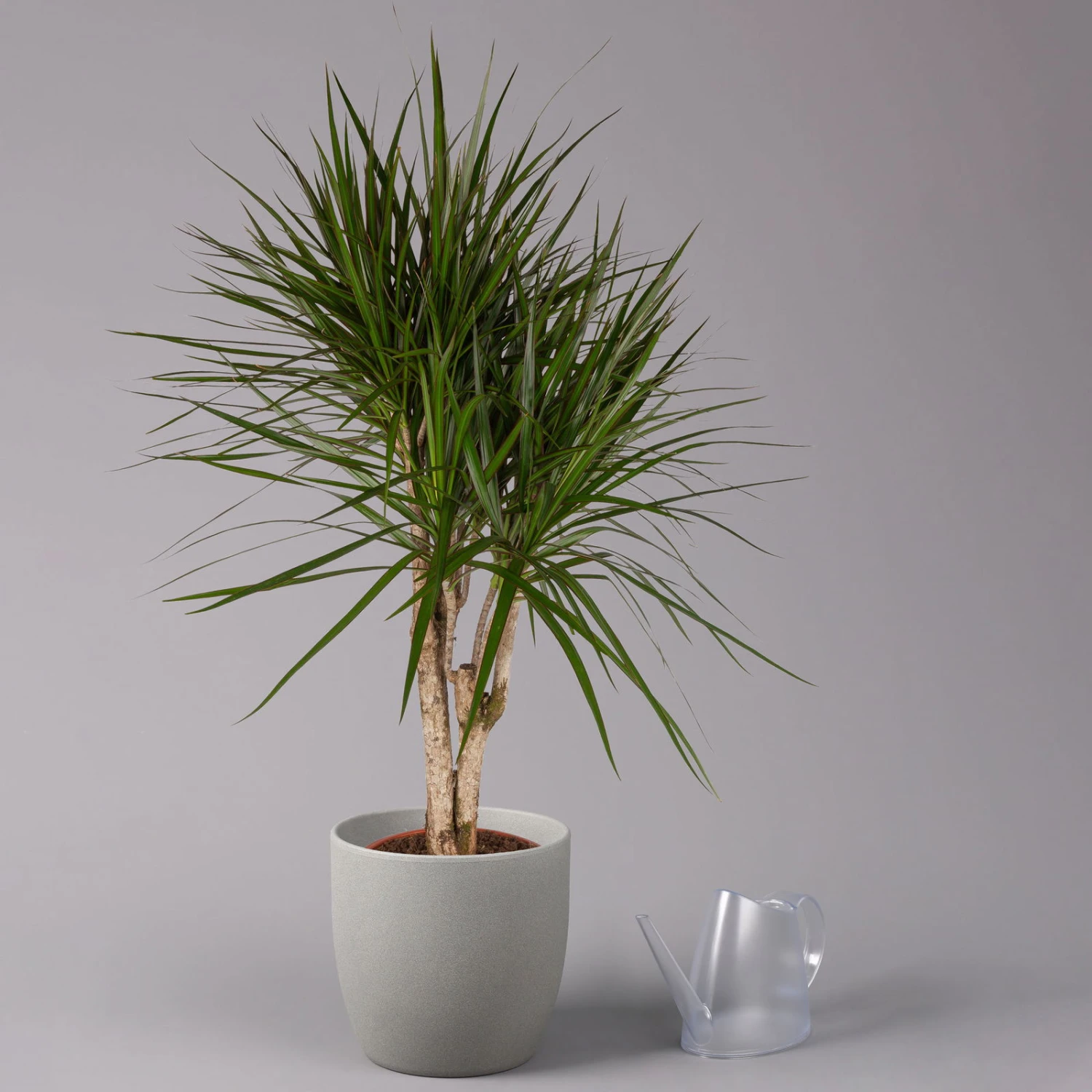Diese Dracaena marginata begeistert mit ihrem dichten, verzweigten Wuchs und eignet sich unter anderem als exotischer Raumteiler oder sympathischer, grüner Akzent. Der Drachenbaum macht in Wohn- oder Geschäftsräumen eine gleich gute Figur und punktet unter anderem mit seiner Eigenschaft, der Luft diverse Schadstoffe wie Benzol oder Xylol nachhaltig zu entziehen. Genau deshalb steht die ‚Dracaena marginata‘ hoch in der Gunst aller Zimmerpflanzenliebhaber und wird gerne als eine Wohlfühlpflanze bezeichnet. Um optimale Wachstumsbedingungen für Ihren Drachenbaum zu schaffen, suchen Sie für die Dracaena marginata einen hellen Standort ohne direkte Sonne aus. Es gilt, beim Gießen eher sparsam zu sein und Staunässe unbedingt zu vermeiden.