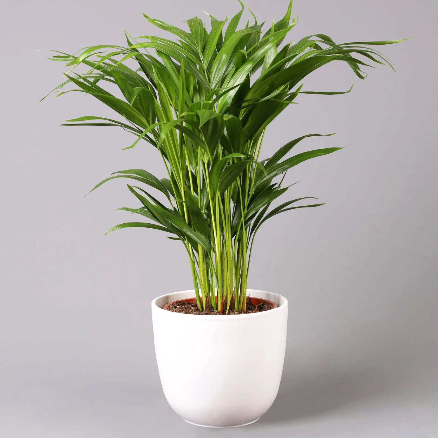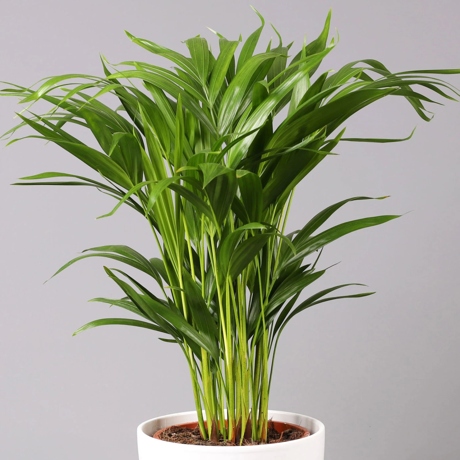 Die Goldfruchtpalme (Dypsis lutescens) ist ein anspruchsloses und dekoratives Palmengewächs von der afrikanischen Insel Madagaskar. Ihre Goldfruchtpalme fühlt sich an halbschattigen Standorten wohl und ist vor direkter Sonneneinstrahlung zu schützen. Pflegen Sie die Dypsis lutescens in den Innenräumen bei Temperaturen über 15 Grad Celsius. Für einen beheizten Wintergarten ist diese Zimmerpflanze genauso wie für Ihre Wohnküche oder Diele die richtige Wahl. Von April bis Oktober legt die Goldfruchtpalme einen hohen Wasserbedarf an den Tag, in der Winterzeit dürfen Sie die Wassergaben reduzieren. Am besten eignet sich zum Gießen lauwarmes und weiches Wasser, auch Sprühbäder tun Ihrer Zierpalme gut. Die Goldfruchtpalme verbessert nachweislich das Raumklima, indem sie der Luft mehrere Giftstoffe entzieht.