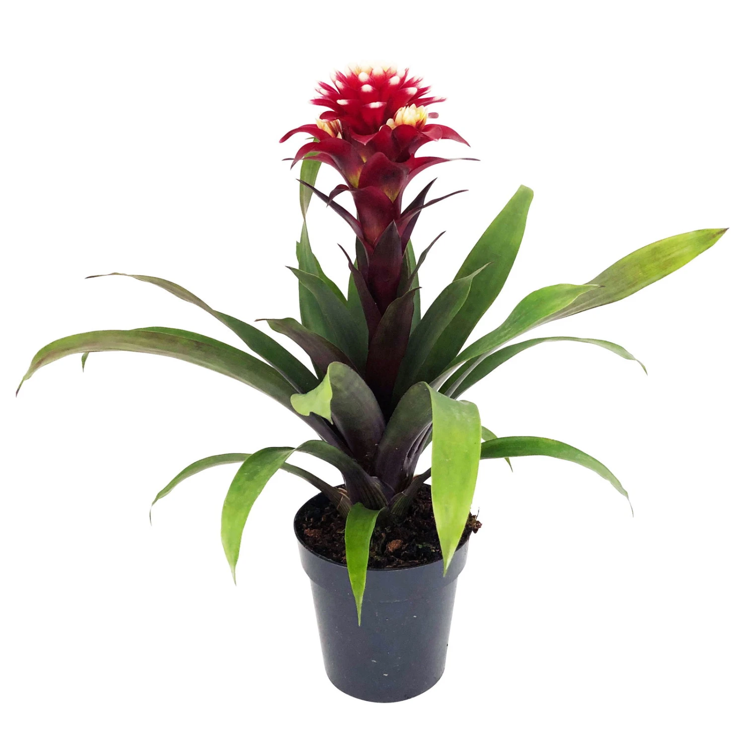 Die Guzmanie ‚Francesca‘ überrascht mit effektvollen, weiß getupften Hochblättern in romantischem Dunkel-lila. Diese äußerst dekorative Guzmania macht in jedem Wohnraum eine gute Figur und eignet sich, dank der hohen CO2-Aufnahme bei Nacht, insbesondere zur Schlafzimmerbegrünung. Für eine erfolgreiche Bromelienpflege sind Raumlufttemperaturen über 20 Grad Celsius notwendig. Nährstoffreiches Substrat mit guter Drainage ist dabei klar von Vorteil. Wir empfehlen, Ihre Guzmanie ‚Francesca‘ nur mit lauwarmem und weichem Wasser zu gießen. Geben Sie immer wieder Wasser direkt in die Blattrosette und verwöhnen Sie Ihre Bromelie mit regelmäßigen Sprühbädern. Im Winter braucht das Tropengewächs aus dem Dschungel Südamerikas weniger Wasser, der Boden darf jedoch nicht austrocknen.