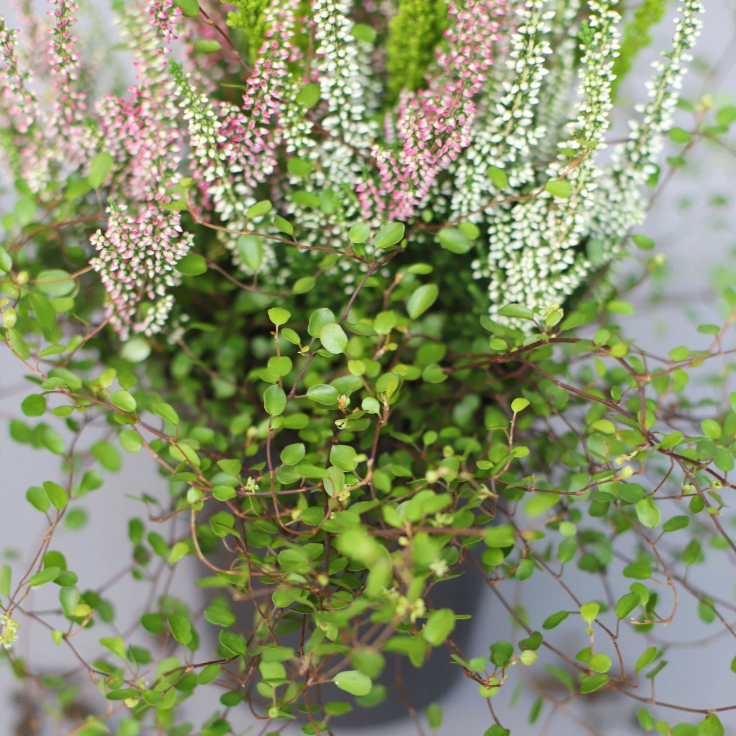 Der Mix aus Knospenheide (Calluna vulgaris), Mühlenbeckie (Mühlenbeckia axillaris) und Baumheide (Erica arborea) bilden mit ihren unterschiedlich aussehenden Blättern eine abwechslungsreiche und herbstliche Einheit. Die Blätter der Mühlenbeckia sind rund, glatt und sattgrün und wachsen an drahtigen, kriechenden Zweigen. Die der Baumheide sind nadelartig und die Blätter der Calluna liegen schuppenförmig am Zweig an. Das gepflanzte Trio wächst buschig und aufrecht, abgesehen von der Mühlenbeckia, die mit leicht überhängendem Wuchs über Töpfe rankt. Die Baumheide ist die größte Pflanze in diesem Heidepflanzen Mix und kann eine Wuchshöhe von bis zu 100 cm erreichen und auch bis zu 60 cm breit werden.