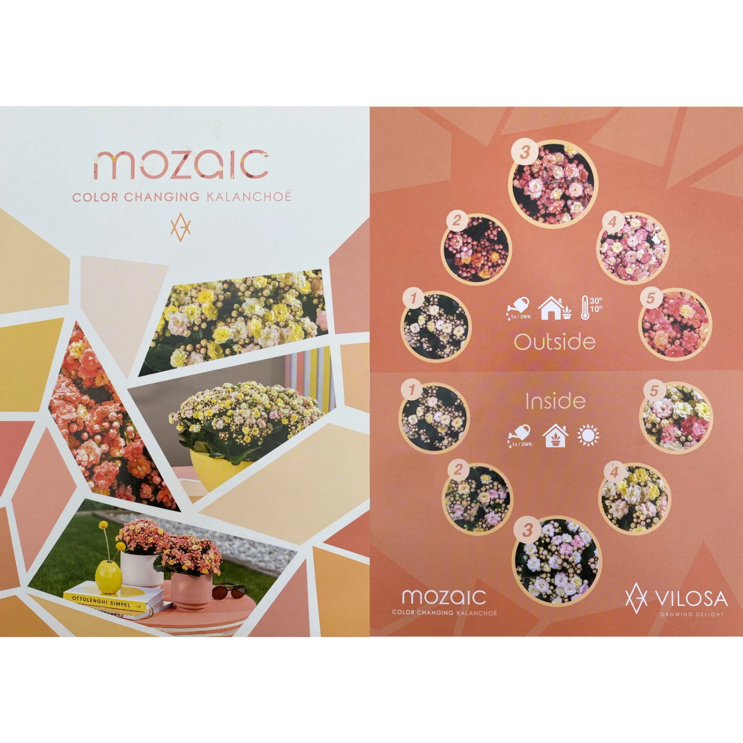 Die vielen, kleinen Blüten sind gefüllt und stehen in Blütenständen zusammen. Die Kalanchoe ‚Mozaic‘ wechselt die Farbe je nach Licht und Temperatur. Somit entscheiden Sie über die Farbe der Blüten. Steht die Kalanchoe ‚Mozaic‘ im Freien bei viel Licht und niedrigeren Temperaturen, werden die Blüten sehr farbintensiv, wobei das Farbspektrum von Gelb über Lachs bis Orange reicht. Steht die Kalanchoe ‚Mozaic‘ im Zimmer, bei geringerer Lichtintensität und höheren Temperaturen, bleiben die Farben eher pastellig und das Farbspektrum reicht von Creme über Gelb bis hin zu Rosa.