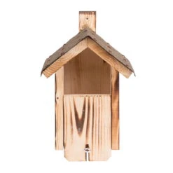 Der hochwertige Nistkasten wurde aus naturbelassenem Fichtenholz gefertigt und mit einem Dach aus Dachpappe versehen.