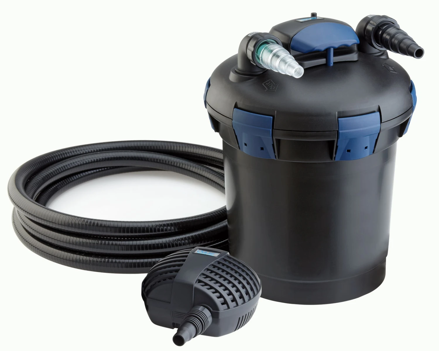 Mit dem BioPress Set 6000 Druckfilterset mit UVC und Filterpumpe steht kristallklarem Teichwasser nichts mehr im Weg – einsetzen, fertig, los. Das Komplett-Druckfilterset BioPress Set 6000 ist mit optimalen Start-Up Eigenschaften ausgestattet. Dank der perfekten Abstimmung zwischen der 2500 l/h Filterpumpe, des Druckfilters und des darin integrierten 9 Watt UVC-Vorklärgerätes werden Teiche bis 6 m³ (bei Fischen bis 3 m³) ermöglicht klar. Selbst höher gelegene Bachläufe werden problemlos mit Wasser versorgt. Mit dem ebenfalls im Set enthaltenen 5 m Schlauch ist das Komplett-Set schnell und unkompliziert angeschlossen.