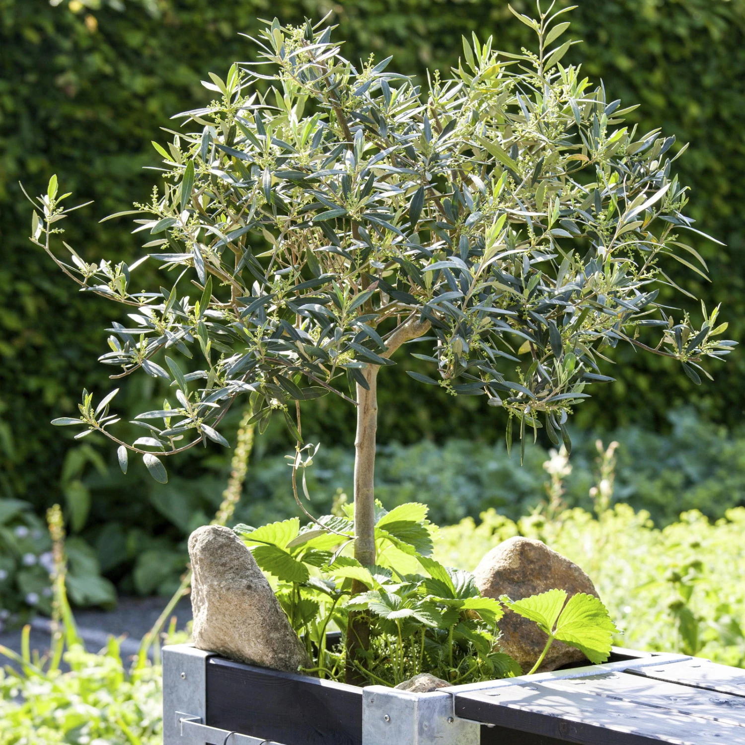 Durch gezielten Rückschnitt lassen sich Oliven wunderbar in Form bringen, da das Gehölz sehr schnittverträglich ist und willig neu austreibt. Durch regelmäßiges Stutzen entwickelt sich über die Jahre eine feinverzweigte, dichte und kompakte Krone.