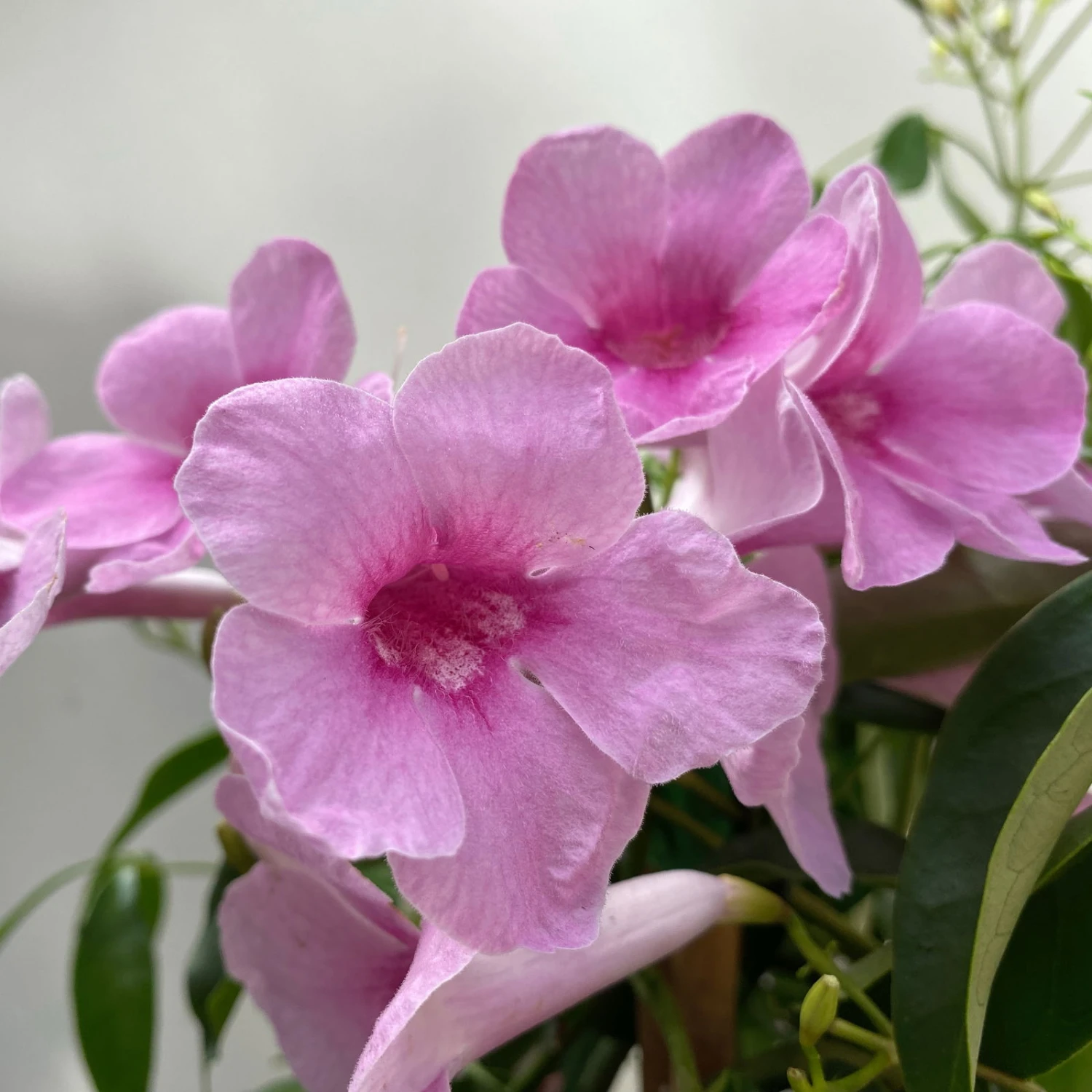 Die Pandorea (Pandorea jasminoides), ist in Australien und Malaysia beheimatet. Die Pandorea überzeugt mit gefiederten, glänzenden, leicht ledrigen Blättern in sattem Grün. Diese robuste und pflegeleichte Kübelpflanze wächst kletternd und kann eine Wuchshöhe von bis zu 3 m erreichen. Dabei richtet sich die Wuchshöhe nach der zur Verfügung stehenden Klettermöglichkeit, hat sie diese nicht zur Verfügung so hängt die Pflanze.