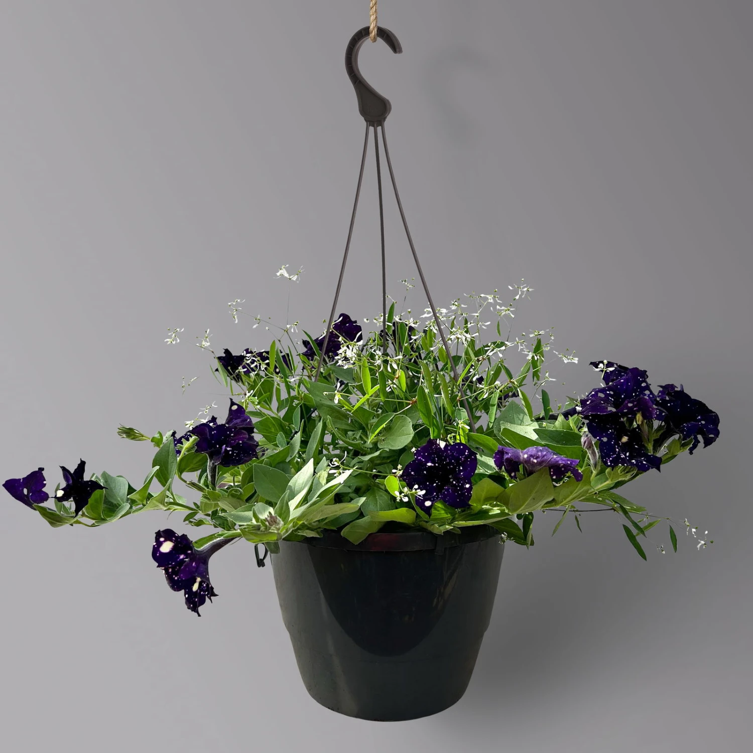 Die Petunie und Schneewolke werden fertig gepflanzt in einem Ampeltopf geliefert. Auspacken – Aufhängen – Fertig