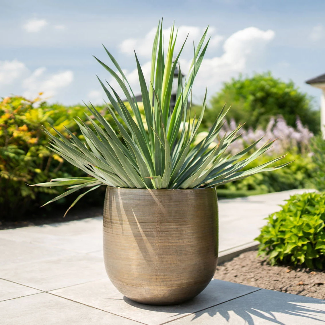 Wenn Sie Ihr Begrünungskonzept outdoor mit einem imposanten Akzent aufwerten möchten, bietet sich das Pflanzgefäß ‚Rowen‘ als eine effektvolle Idee an. Dieser Pflanztopf aus Leichtmetall Aluminium fasst rund 35 Liter und präsentiert sich in der noblen Goldfarbe. Dank einer per Hand aufgetragenen, dekorativen Oberflächenstruktur begeistert jedes Exemplar mit einem individuellen Touch. Dabei ist das Metall Aluminium nicht nur ein Leichtgewicht, sondern auch witterungsbeständig und rostfrei. Somit können Sie das Pflanzgefäß ‚Rowen‘ in Goldoptik dauerhaft auf Ihrer Terrasse, Loggia oder auf Ihrem Balkon einsetzen. Bepflanzen Sie den Blumentopf mit einem dekorativen Orangenbäumchen, mit Buxus oder zum Beispiel mit einer fantasievollen Kombination aus Rosen, Lavendel und Efeu.