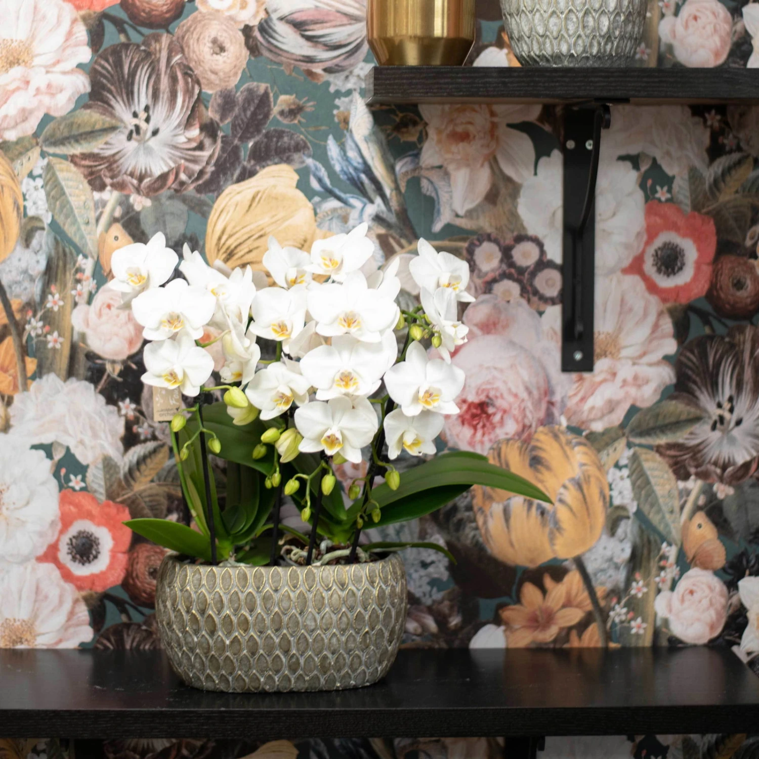 Dank ihrer schneeweißen, zarten Blüten sieht diese Schmetterlingsorchidee romantisch und edel aus. Die Phalaenopsis ist in den Regenwäldern Südostasiens zuhause und gedeiht nur in einer feuchten und warmen Umgebung an einem hellen bis halbschattigen Standort. Denken Sie daran, dass die Schmetterlingsorchideen keine Staunässe vertragen, dafür aber von einem Tauchbad in zimmerwarmem, weichem Wasser profitieren. Alle zwei Wochen ist eine Düngung mit speziellem Orchideendünger, zum Beispiel von unserer Marke Kölle‘s Beste, zu empfehlen. Wenn Sie Ihre Phalaenopsis umtopfen möchten, dann ist als Substrat die Orchideenerde die richtige Wahl. Die pflegeleichte Schmetterlingsorchidee ist eine formschöne Zimmerpflanze fürs Zuhause oder Büro und macht sich dank der geringen Rispenhöhe als Tischdeko besonders gut.