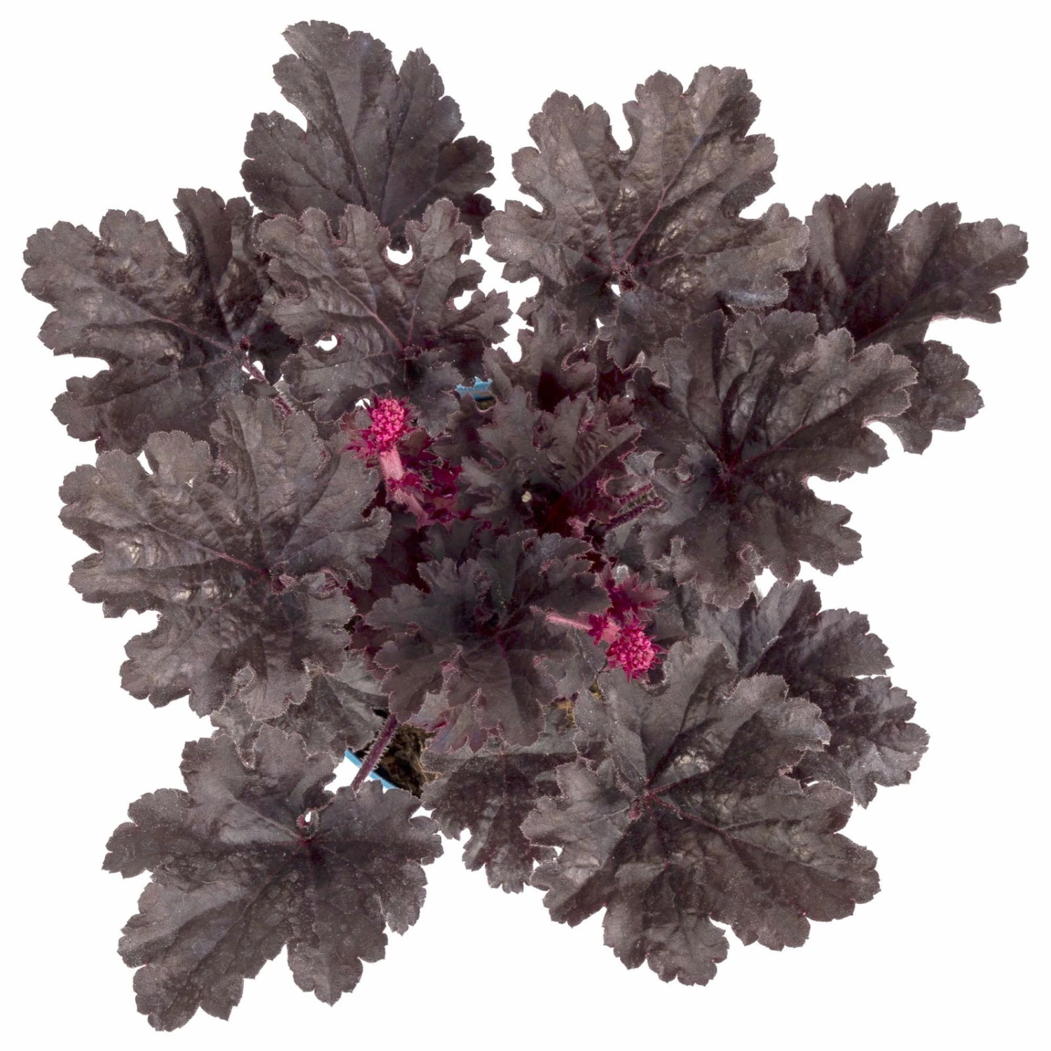 Das Purpurglöckchen ‚Timeless Night‘ (Heuchera ‚Timeless Night‘) begeistert mit einem buschigen und aufrechtem Wuchs. Die Blätter der auffälligen Blattschmuckstaude leuchten in schwarz-violett. Setzen Sie farbenprächtige Highlights in Ihrem Garten. Von Juni bis August thronen zudem korallrote Blüten über dem schmuckvollen Laub.