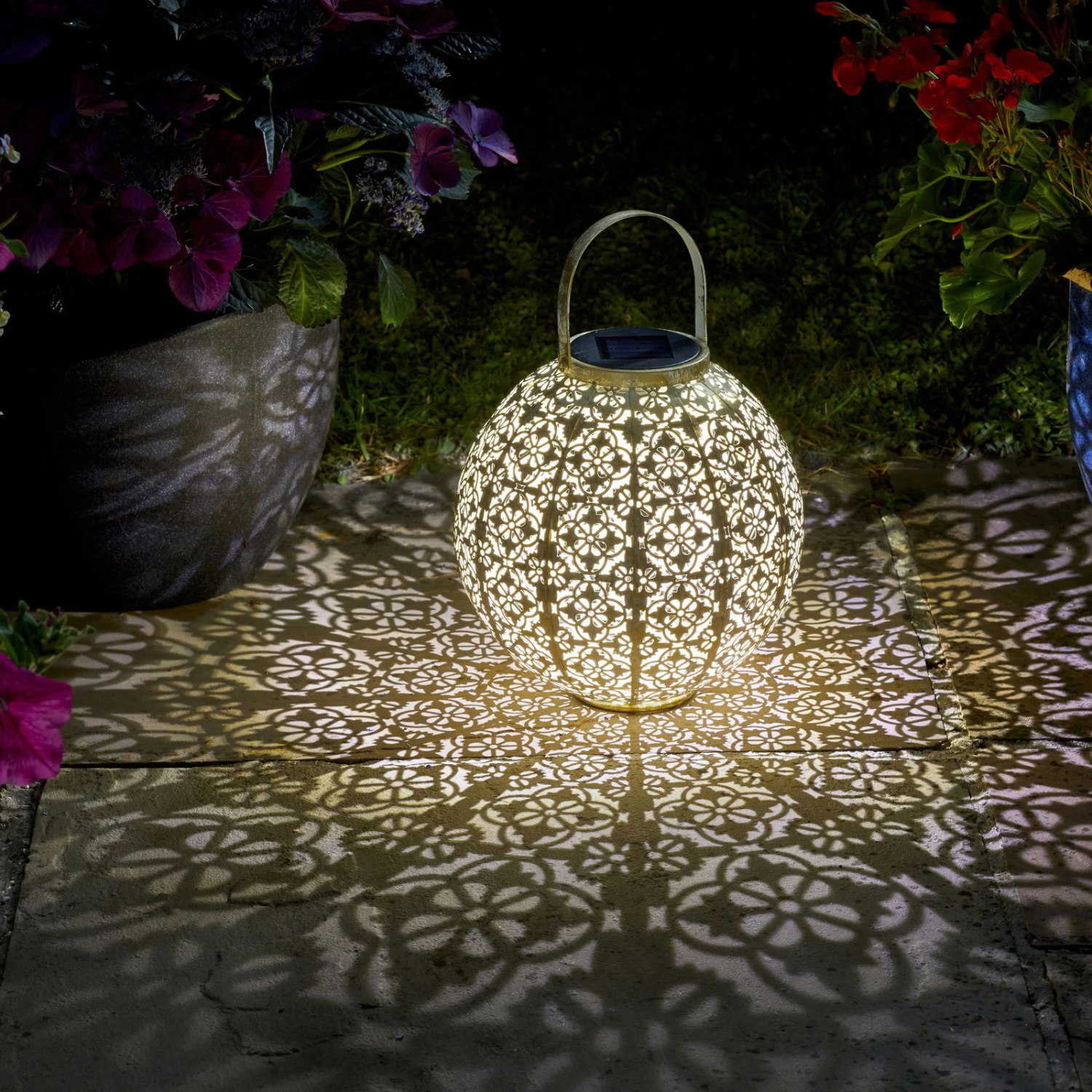 Die außergewöhnliche und besonders hübsche Solarleuchte „Damast“ aus Metall begeistert im nordafrikanischen Design und natürlicher Farbe. Die Solarlaterne in Form einer Kugel ist für den Outdoorbereich bestens geeignet und dafür konzipiert. Am Tag überzeugt die Solar Laterne als charmante Deko, bei Dunkelheit zeigt sie eine spektakuläre Beleuchtung in Ihrem Garten, auf der Terrasse, dem Balkon oder auf dem Weg Ihres Hauses. Mit der schönen Solar Laterne zaubern Sie Stück für Stück eine Wohlfühloase aus Ihrem Garten. Die solarbetriebene Leuchte besitzt ein warmweißes, angenehmes Licht und bringt Helligkeit nach Draußen. Das Muster in der Metallwand der Lampe wird durch das Licht reflektiert und zeichnet wunderschöne Ornamente auf den Boden und die Wand.