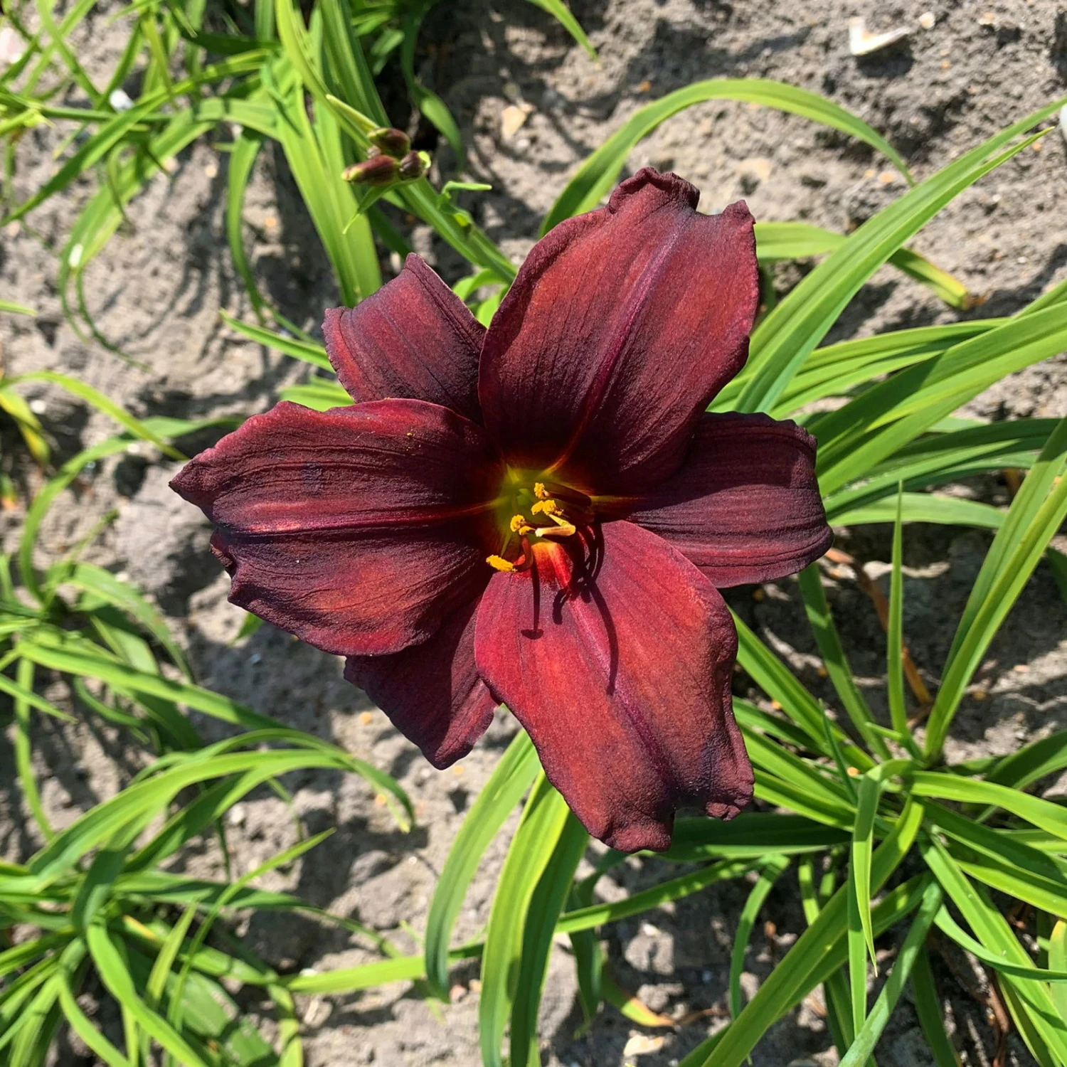 Die schmalen, langen, überhängenden Blätter der Taglilie (Hemerocallis ‚American Revolution‘) begeistern mit satt grüner Farbe. Die Taglilie wächst buschig mit bogig überhängendem Laub. Diese herrliche, robuste Staude kann eine Wuchshöhe von bis zu 80 cm erreichen.