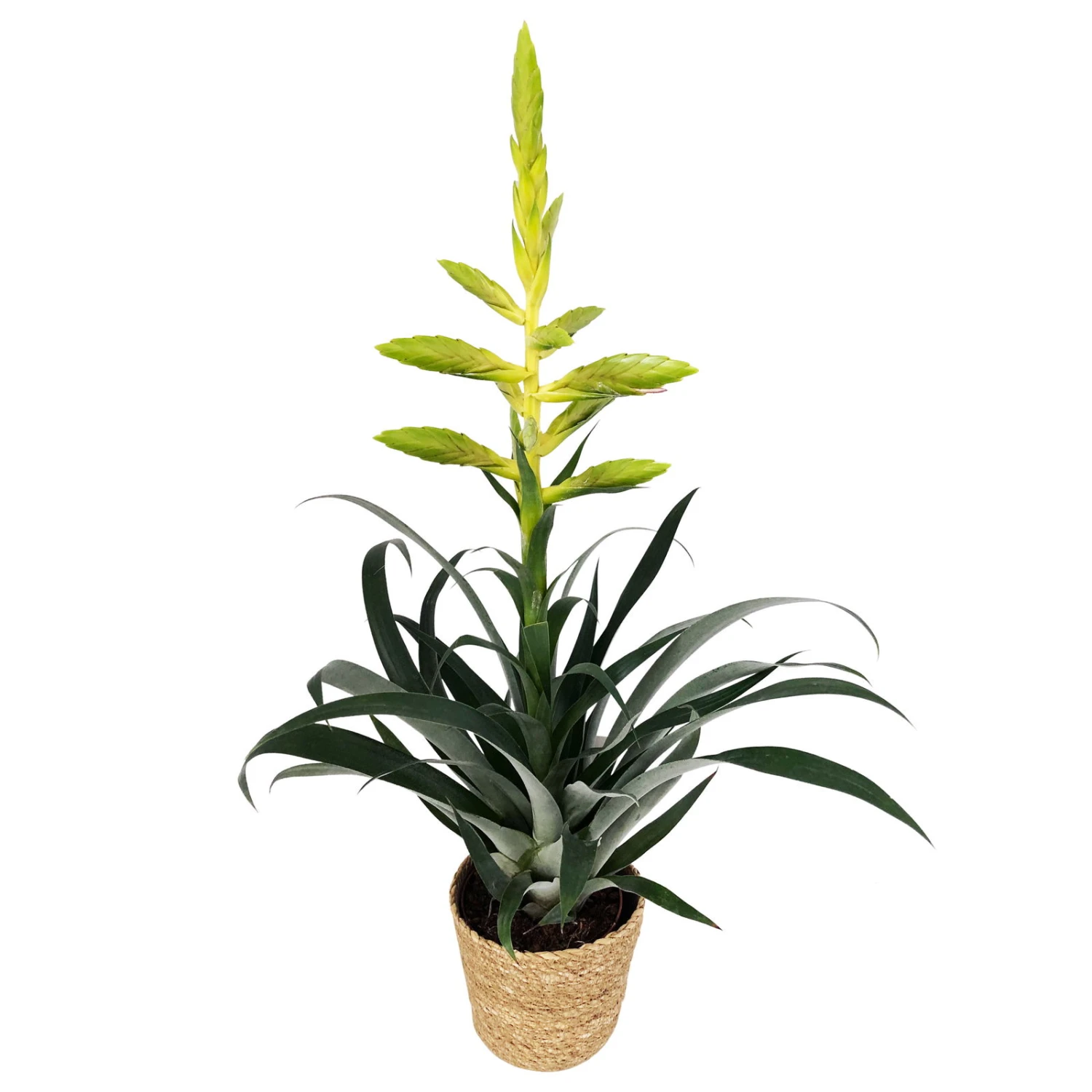 Die Tillandsia oerstediana ist dank ihrer dekorativen Blütenstände in leuchtendem Gelb ein farbenfroher, lebendiger Akzent für Ihr Zuhause. Sie erhalten Ihre Tillandsie in dem geschmackvoll gestalteten Korb Maki aus Seegras, der mit allen naturbetonten Wohnstilen hervorragend harmoniert. Diese Zierpflanze fühlt sich an hellen Standorden wohl, ist aber vor direkter Sonne zu schützen. Denken Sie daran, dass Bromelien als tropische Gewächse nur bei Raumtemperaturen über 20 Grad Celsius zu pflegen sind. Hohe Luftfeuchtigkeit ist für die Pflanzengesundheit ebenfalls wichtig, daher empfehlen wir regelmäßige Sprühbäder. Zum Gießen eignet sich weiches, lauwarmes Wasser. Da die Tillandsia oerstediana bei Nacht hohe Mengen an CO2 aufnimmt, dürfen Sie die Bromelie gerne zum Begrünen Ihres Schlafzimmers einsetzen.