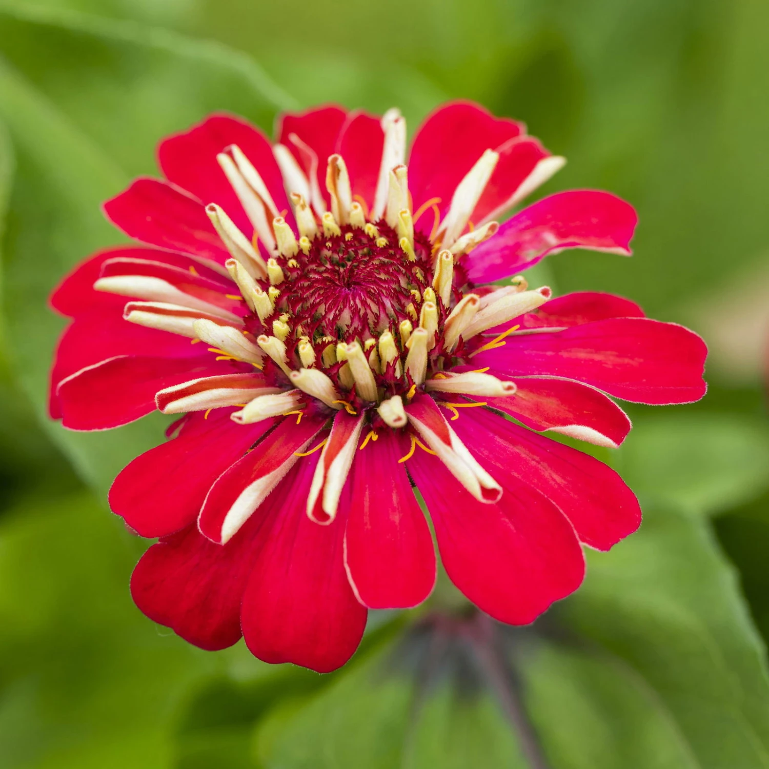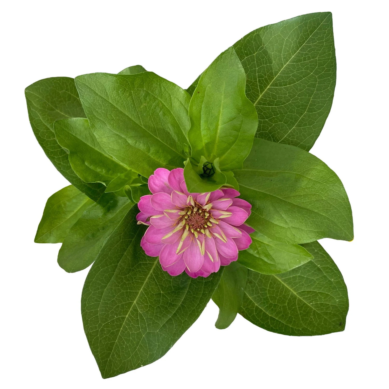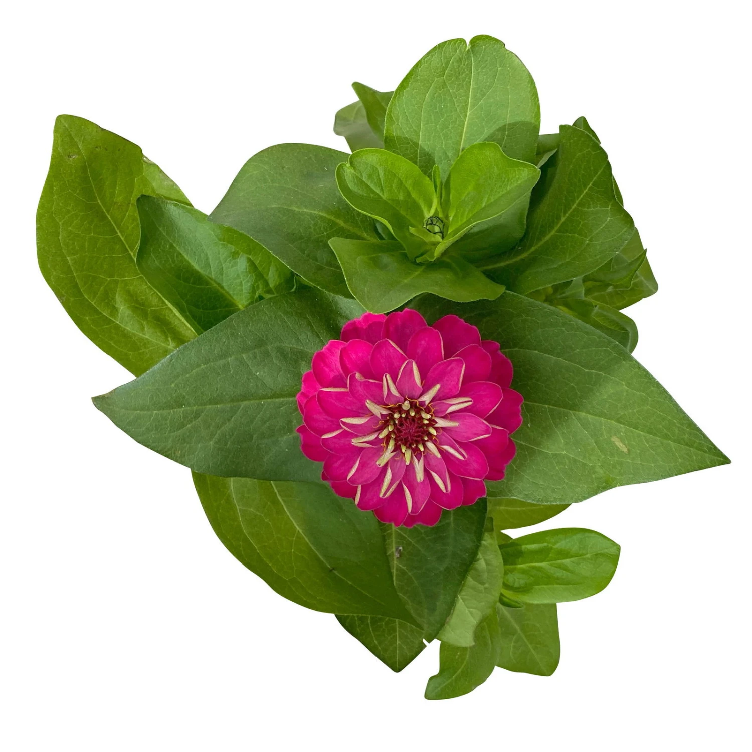 Die leicht beharten Blätter und Stiele der Zinnie, Zinnia elegans, varrieren in ihrem Grün je nach Sorte von einem saftigem Grün bis hin zu einem dunklem Grün. Auch die Form der Blätter ist von Sorte zu Sorte unterschiedlich und reicht von einer elliptischen bis zu einer eher dreieckigen Form. Ihren Ursprung hat die einjährige Pflanze in Mexico. Die Zinnie kann abhängig von der Sorte eine Höhe von bis zu 70 cm erreichen.