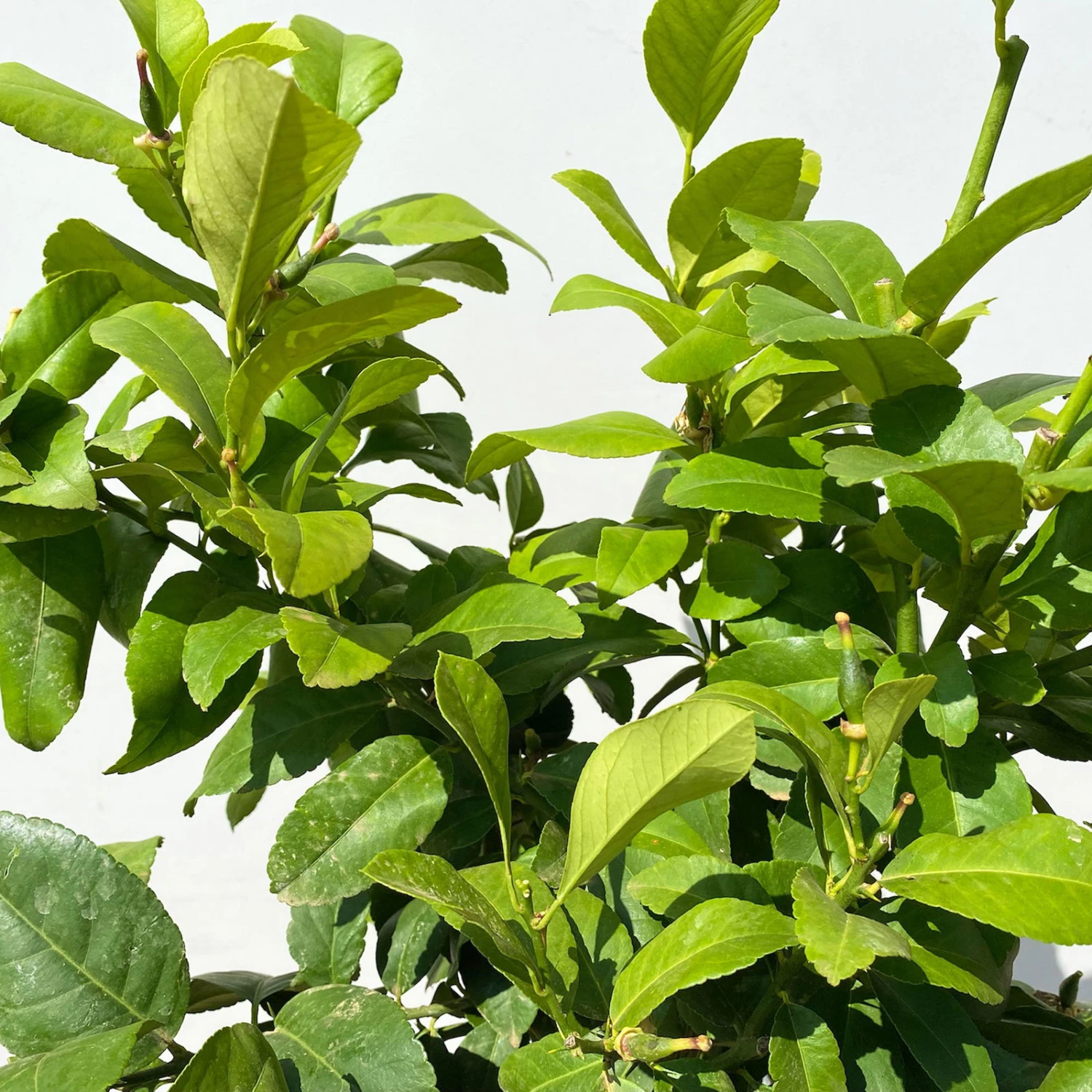 Die länglich ovalen, vorne zugespitzten Blätter des Zitronenbaumes (Citrus limon) begeistern das ganze Jahr über mit satt grüner Farbe. Das Zitronenbäumchen bildet einen Stamm mit einer Krone, die teils etwas sparrig wächst. Die mediterrane Kübelpflanze kann eine Wuchshöhe von 4-5 Metern erreichen, die im Kübel aber nur selten erlangt werden.